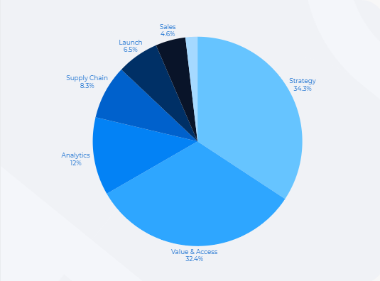 Strategy continues to be a core growth engine, representing 34% of all client mandates. Demand is being fuelled by the need for differentiated portfolio planning, evidence-based commercial strategy and increasingly complex product-level decision-making.