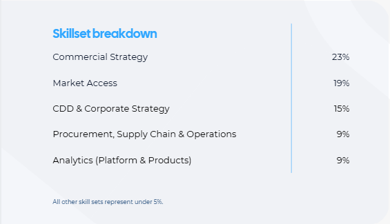 Commercial roles continue to dominate the recruitment landscape, with over 35% of client requests focused on Corporate and Commercial Strategy talent. This reflects continued demand for expertise in growth strategy, deal support, and commercial due diligence. Within Life Sciences specifically, hiring has centred heavily on New Product Planning and Product Portfolio Strategy.